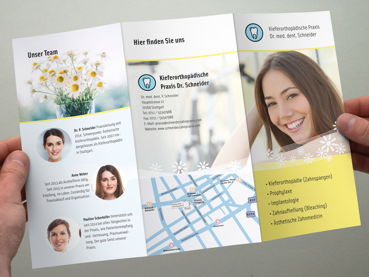 Der Flyer informiert die Patienten über die speziellen Behandlungsmöglichkeiten, die Öffnungszeiten der Praxis und die besten Anfahrtsmöglichkeiten.